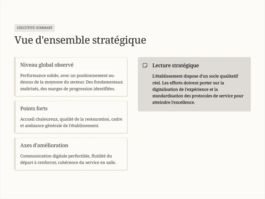 Afin de faciliter la lecture et l’appropriation de nos analyses, nous avons intégré une synthèse exécutive claire et structurée, permettant d’accéder rapidement aux points essentiels, tout en conservant un rapport détaillé complet pour une analyse approfondie.