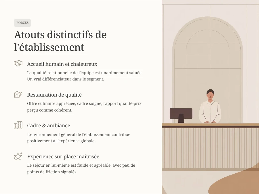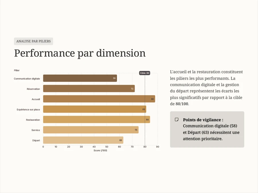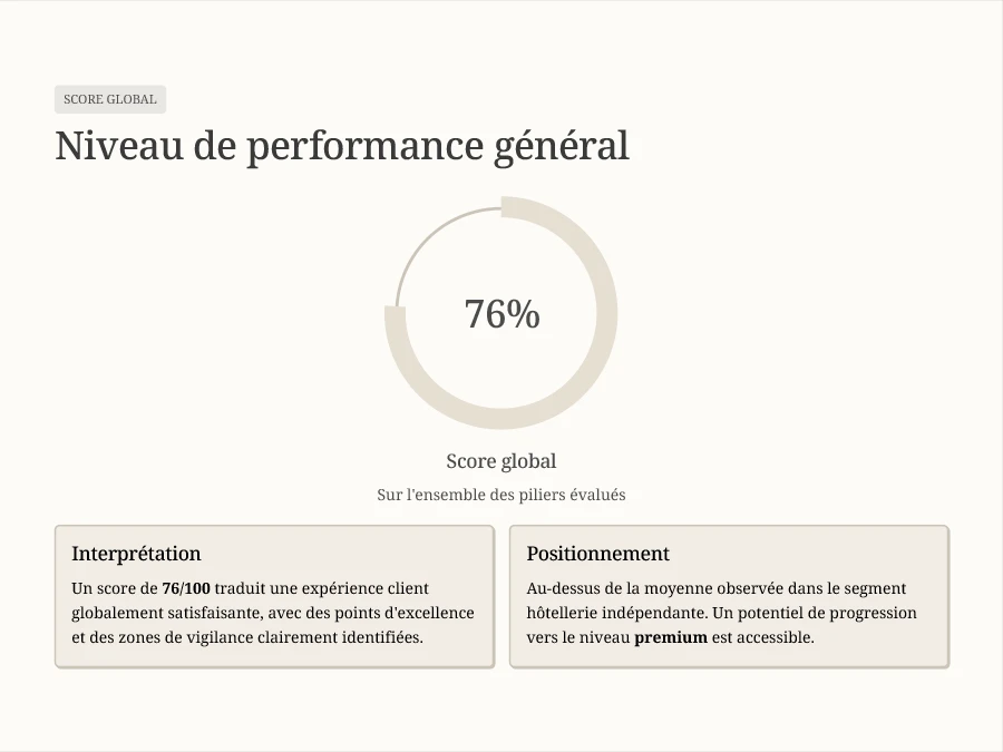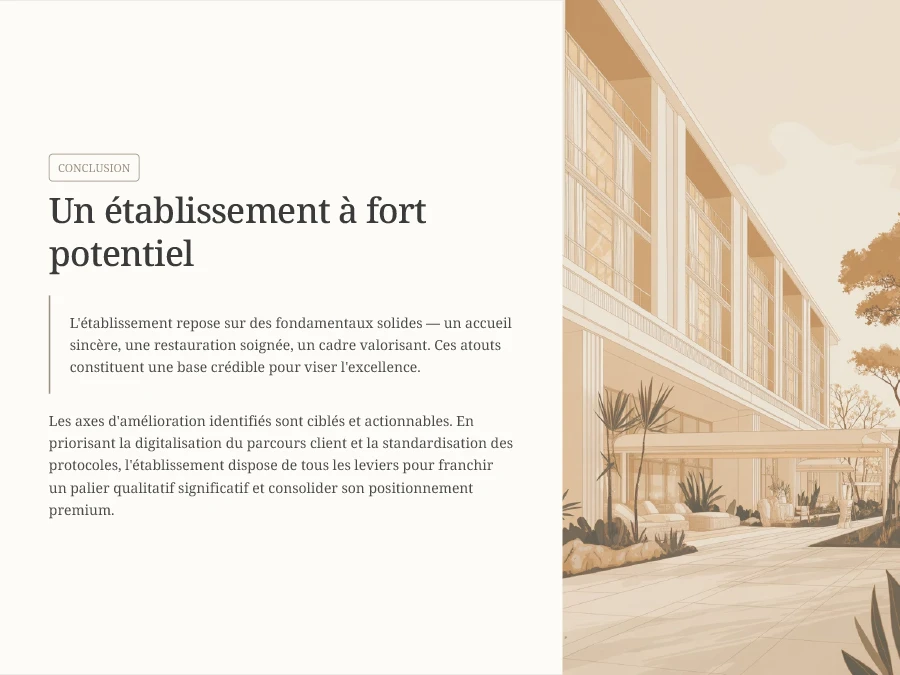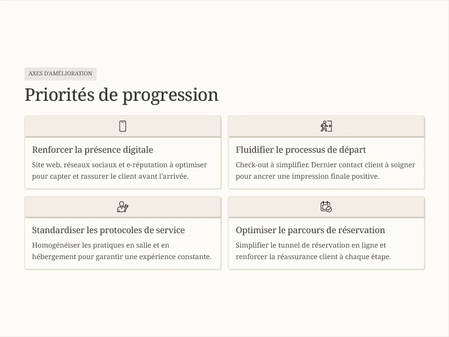 Nous analysons l’efficacité de vos opérations quotidiennes, incluant la gestion des réservations, l’accueil des clients, la maintenance des chambres et des espaces communs, ainsi que la coordination entre les différents départements.